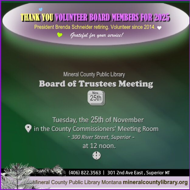 12 - 1 pm Thurs.: Help learning your Device: Computer, phone, wi-fi? Or call for appt: 406 822-3563.