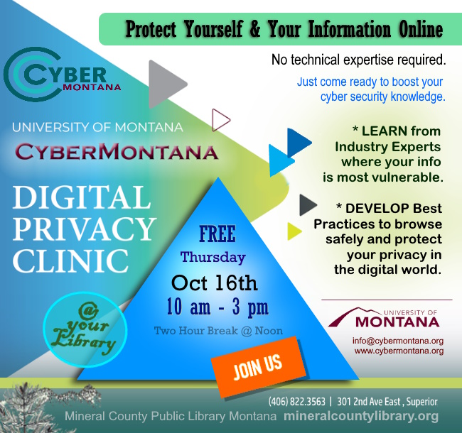 On October 16th, Thursday, All Day, the Library is offering a Cyber Security Class. Starts at 10 am, lunch at noon, ends at 3 pm. Call us to sign up!