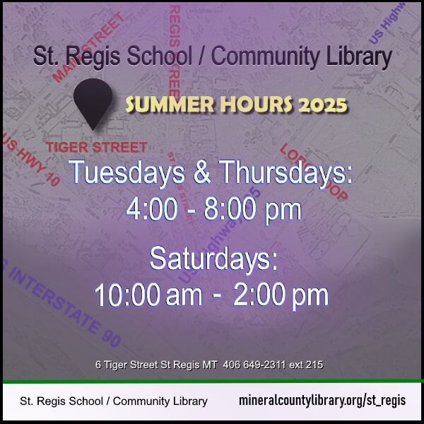 The St. Regis Community Library is located in the St. Regis Public School Building at 6 Tiger Street in St Regis MT 59866.