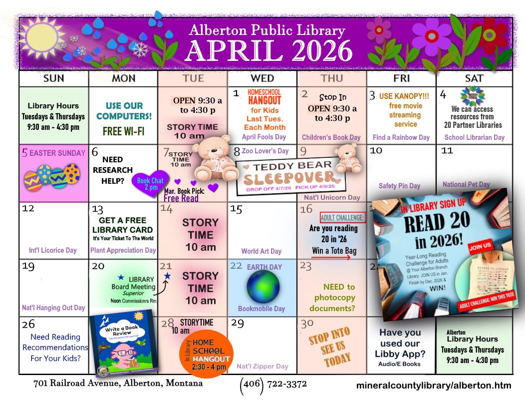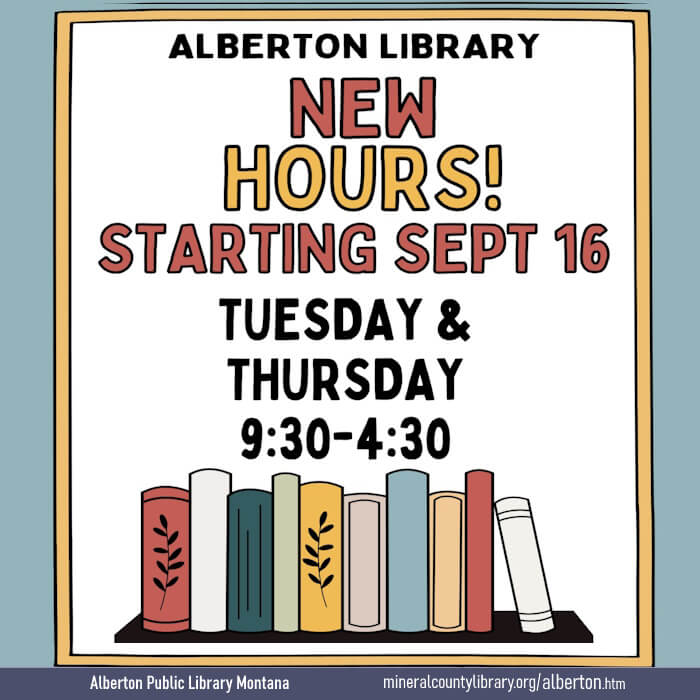 The Alberton Branch / Public Library in Alberton, Montana, is located in the town's historic Community Center. Something's always happening. Join us.
