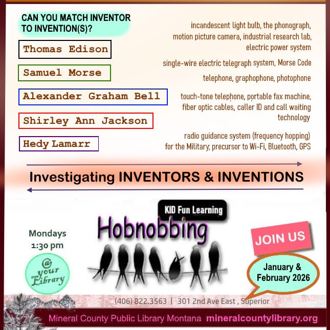 12 - 1 pm Thurs.: Help learning your Device: Computer, phone, wi-fi? Or call for appt: 406 822-3563.